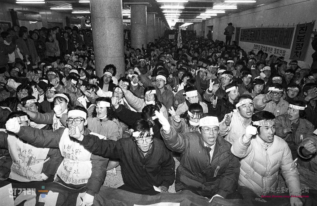 - 1988년 11월 30일 오후6시30분 서울지역노동조합협의회, 전국병원노조협의회, 연구전문기술노조협의회 등 서울 업종 노조협의회 소속 노동자 1천 2백여명이 서울 지하철 1호선 시청옆 대합실에서 노조탄압 분쇄 및 노동악법 개정촉구를 위한 청와대 규탄대회를 갖고 노동3권보장과 노동악법 폐지 등을 요구하며 시위를 벌이고 있다.