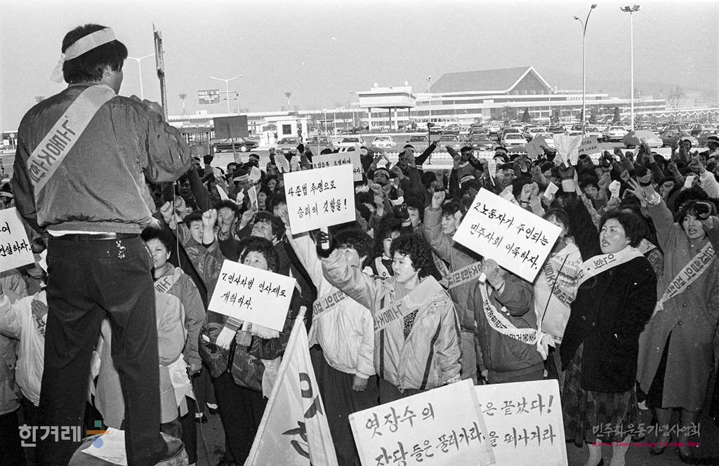 - 1988년 12월 1일. 국제공항관리공단 노조원들이 단체교섭이 결렬되자 노동자의 권익을 외면하는 이사장의 즉각 퇴진 등을 요구하며 김포공항 국내선 청사앞에서 농성을 벌이고 있다.