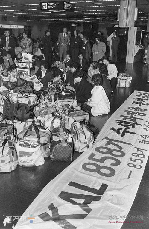 - 1988년 12월 1일 오후5시30분 지난달 29일 타이의 방콕에서 거행된 대한항공858기 폭파사건 희생자 추도식에 참석했던 유가족 90여명이 김포공항 국제선 제2청사 입국대합실에서 858기 수색과정 공개, 살인자 김현희의 공개재팬과 처형 위령합 건립을 요구하며 농성을 벌이고 있다.