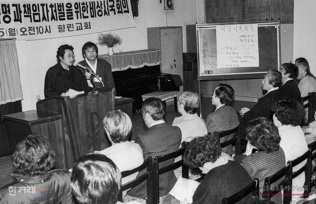 - 1988년 12월 5일 오전10시 전두환 이순자 구속처벌을 위한 투쟁본부의 제의로 전국 가계를 대표하는 40여개 재야민주단체가 참여하는 광주학살 5공비리 진상규명과 책임자 처벌을 위한 비상시국회의가 서울 중구 향린교회에서 열려 오는 10일 서울 등 주요 도시에서 제4차 궐기대회를 열기로 결의하고 투쟁본부 가입 18개 단체 대표를 중심으로 7일가지 시한부 농성에 들어가기로 밝히고 있다.