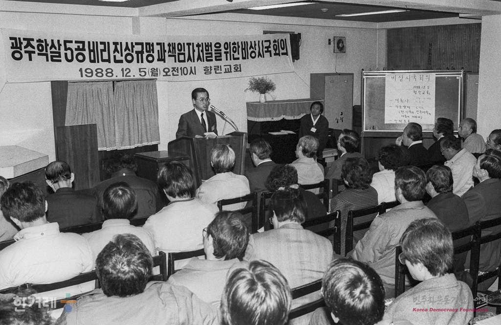 - 1988년 12월 5일 오전10시 전두환 이순자 구속처벌을 위한 투쟁본부의 제의로 전국 가계를 대표하는 40여개 재야민주단체가 참여하는 광주학살 5공비리 진상규명과 책임자 처벌을 위한 비상시국회의가 서울 중구 향린교회에서 열려 오는 10일 서울 등 주요 도시에서 제4차 궐기대회를 열기로 결의하고 투쟁본부 가입 18개 단체 대표를 중심으로 7일가지 시한부 농성에 들어가기로 밝히고 있다.