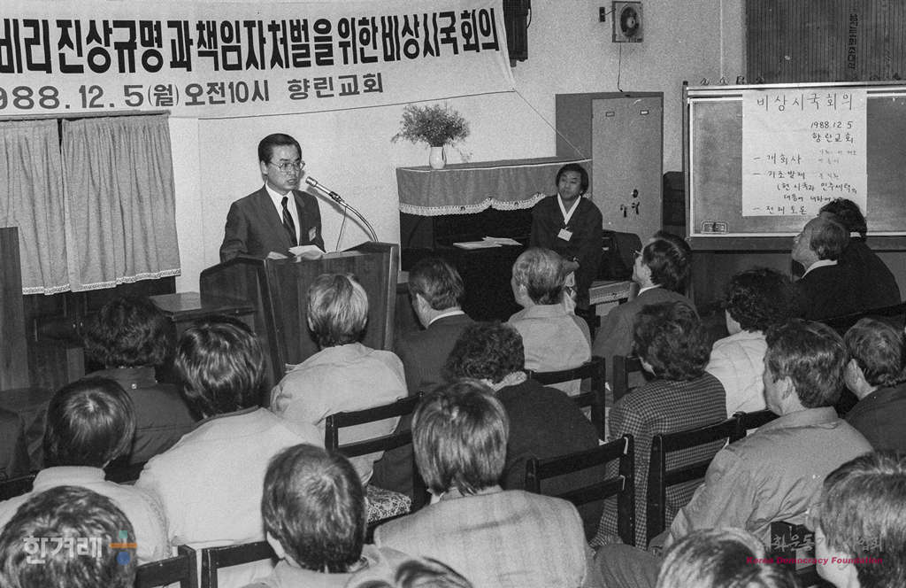 - 1988년 12월 5일 오전10시 전두환 이순자 구속처벌을 위한 투쟁본부의 제의로 전국 가계를 대표하는 40여개 재야민주단체가 참여하는 광주학살 5공비리 진상규명과 책임자 처벌을 위한 비상시국회의가 서울 중구 향린교회에서 열려 오는 10일 서울 등 주요 도시에서 제4차 궐기대회를 열기로 결의하고 투쟁본부 가입 18개 단체 대표를 중심으로 7일가지 시한부 농성에 들어가기로 밝히고 있다.