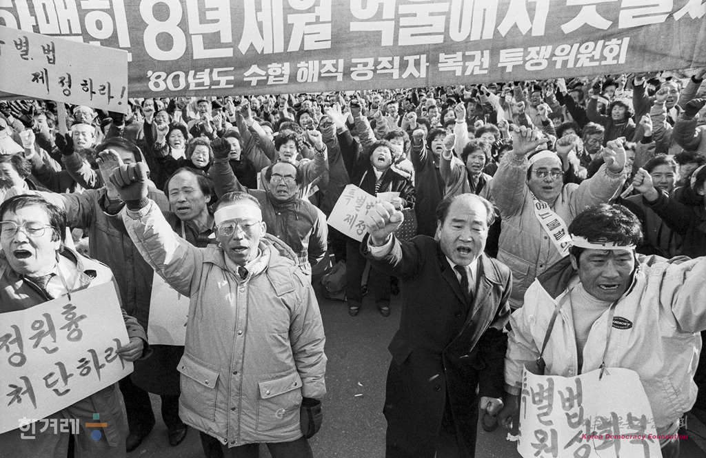 - 1988년 12월 5일 80년대 해직공직자 1천5벽여명은 서울 여의도 국회의사당 앞에서 ’80불법해직공직자 전국총궐기대회‘에서 해직된 뒤 숨진 공무원들의 합동위령제를 열고 있다. 이날 해직공자들은 정부의 기만적인 50% 보상을 철회하고 모든 해직공직자를 즉각 원상복직을 요구하며 시위를 벌이고 있다.
