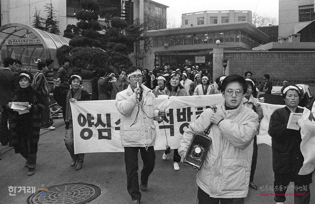 - 1988년 12월 7일 민주화실천가족운동협의회 소속 회원들이 서울 인사동 민정당 당사앞에서 전두환 이순자 즉각구속과 양심수 석방. 남민전 구미휴학생사건 관련자와 조작된 간첩피해자를 모함한 모든 장기수 석방, 수배조치 해제를 요구하며 시위를 벌이고 있다.