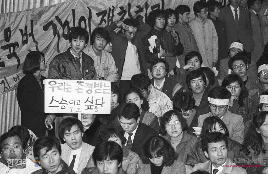 - 1988년 12월 8일 전국교사협의회 소속 서울교사협의회 소속 교사들이 서울 서초구 서초동 서울고 강당에서 민주교육법 쟁취대회를 갖고 야권 3당이 마련한 교육관계법 개정 단일안의 조속한 국회통과를 촉구하고 법개정에 반대하고 있는 사학재단연합과 교장단회를 규탄하고 있다.