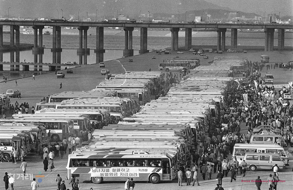 - 1988년 12월 9일 오후3시 한국노총 소속 전국의 노조 대표자들이 서울 삼성동 잠실학생운동장에서 열린 노동악법개정 촉구 및 삼성규탄 전국대표자 궐기대회를 참석하기 위해 대절한 버스를 타고 전국에서 행사장으로 집결하고 있다.