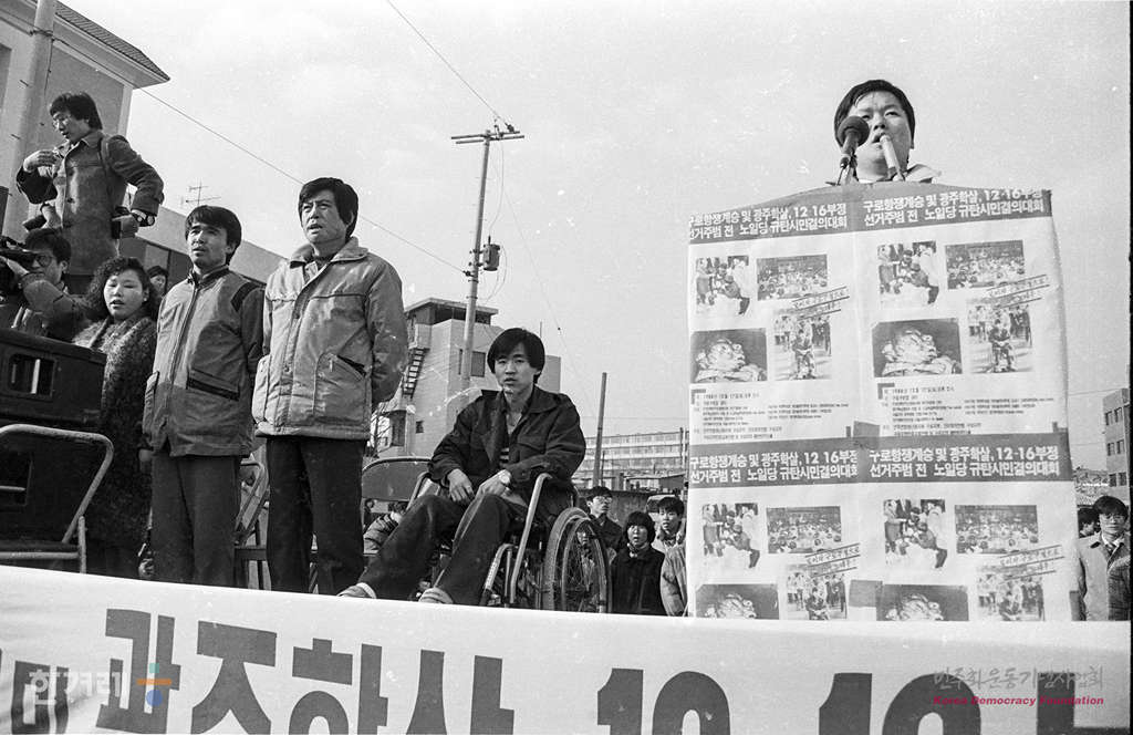 - 1988년 12월 17일 전민협 산하 광주, 5공투위와 구로구청 부정선거 항의투쟁동지회, 서총련, 국민운동본부 등 4개 단체 주최로 서울 구로구청옆 빈터에서 시민 학생등 3천 여명이 참석한 가운데 구로항쟁계승 및 광주학살 12.16 부정선거 주범 전, 노일당 규탄시민대회가 열려 당시 부상을 당한 양원태시가 휠체어를 타고 참석해 인사를 하고 있다.