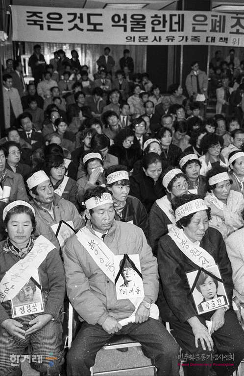 - 1988년 12월 19일 오후 2시 반고문 반폭력 인간선언대회가 서울 종로구 연지동 기독교회관 2층 대강당에서 김대중, 권인숙, 김근태씨등 고문 및 폭력 피해자들과 가족 시민 학생 등 3백여명이 참석한 가운데 열리고 있다.