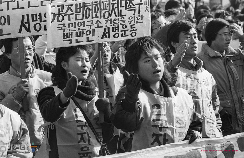 - 1988년 12월 20일 연구자율성 확보와 민주적운영 등을 요구하며 일주일째 파업을 하고 있는 산업연구원, 한국개발연구원, 한국과학기술원, 정신문화연구원 등 연구 전문 기술노조협의회 소속 노조원 8백여명은 서울 동대문구 청량리동 한국과학기술원에 모여 정부와 연구기관쪽에 조속한 대책마련을 촉구하는 집회를 하고 있다.