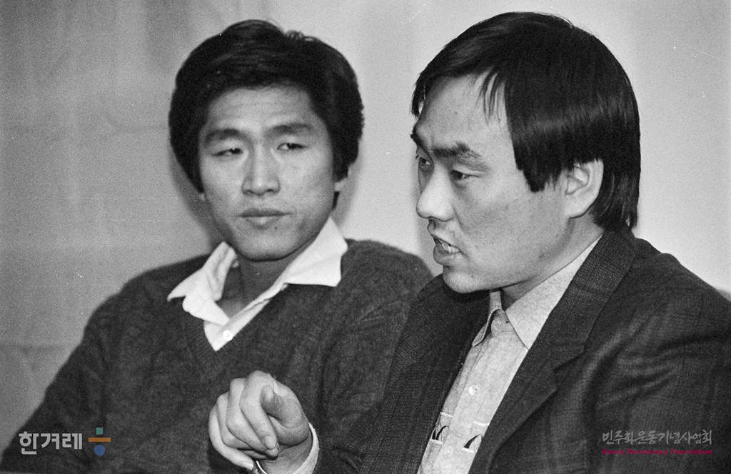 - 1988년 12월 20일 대규모 시국 공안사범 석방을 앞서 시국사범으로 처리되며 구속이 취소되며 풀려난 김종수(한울 대표 )와 이재선 (과학과 사상 전 대표)가 석방 뒤 한겨레신문과 인터뷰를 하고 있다.