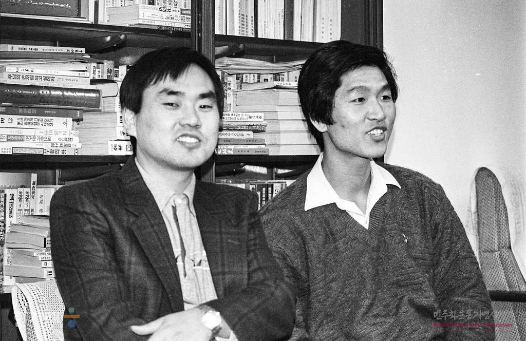 - 1988년 12월 20일 대규모 시국 공안사범 석방을 앞서 시국사범으로 처리되며 구속이 취소되며 풀려난 김종수(한울 대표 )와 이재선 (과학과 사상 전 대표)가 석방 뒤 한겨레신문과 인터뷰를 하고 있다.
