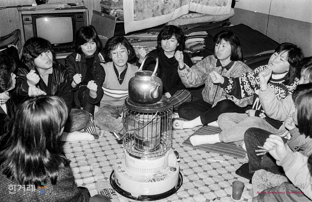 - 1988년 12월 20일 60일 넘게 서울 영등포구 신명교회에서 농성중인 신애전자 여성노동자들. 40여명이 함께 기거하면서 농성중이지만 농성장으로 사용중인 신명교회에서도 나가야 되는 형편이라 농성을 계속할 방을 구하기가 어려워 이삼중의 어려움을 겪고 있다.