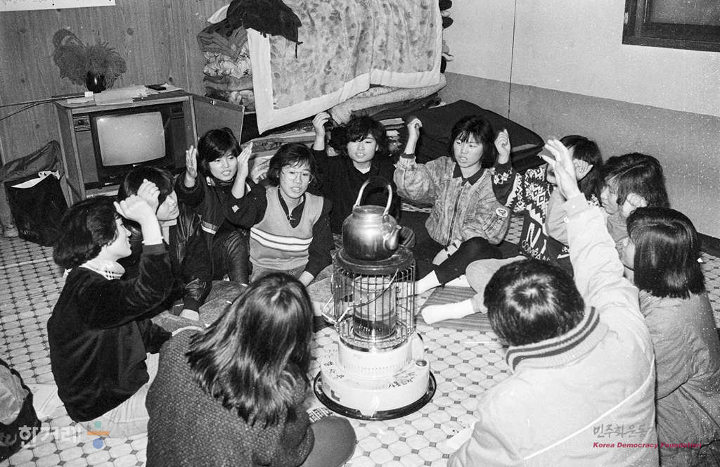 - 1988년 12월 20일 60일 넘게 서울 영등포구 신명교회에서 농성중인 신애전자 여성노동자들. 40여명이 함께 기거하면서 농성중이지만 농성장으로 사용중인 신명교회에서도 나가야 되는 형편이라 농성을 계속할 방을 구하기가 어려워 이삼중의 어려움을 겪고 있다.