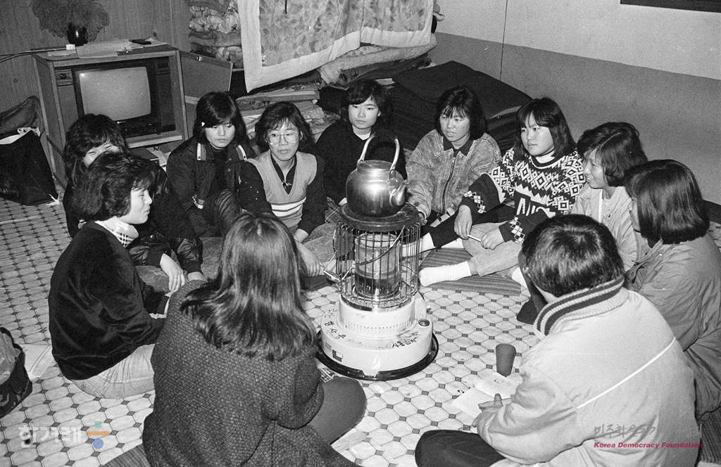 - 1988년 12월 20일 60일 넘게 서울 영등포구 신명교회에서 농성중인 신애전자 여성노동자들. 40여명이 함께 기거하면서 농성중이지만 농성장으로 사용중인 신명교회에서도 나가야 되는 형편이라 농성을 계속할 방을 구하기가 어려워 이삼중의 어려움을 겪고 있다.