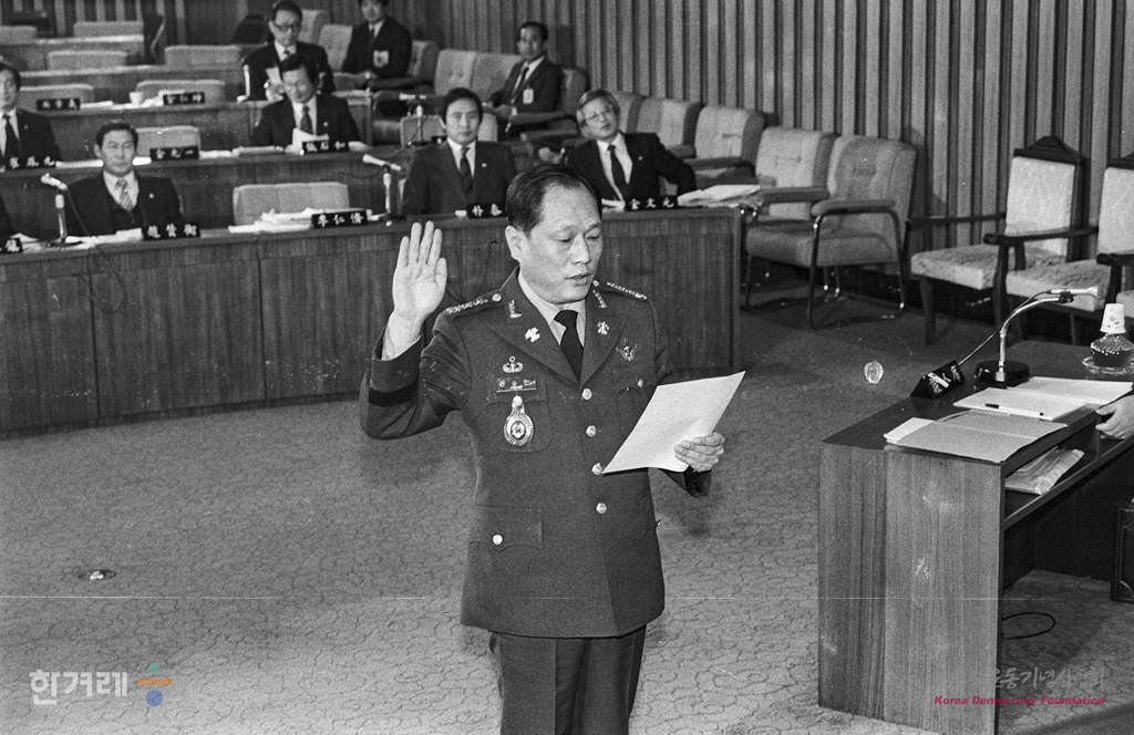 - 1988년 12월 20일 국회 광주특위는 광주항쟁의 진상규명을 위한 3차 청문회가 국회에서 열려 권승만 전 7공수33대대장이 증언선서를 하고 있다
