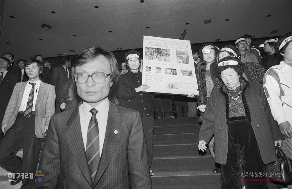 - 1988년 12월 20일 오전 11시 20분 광주특위 청문회가 진행중인 서울 여의도 국회의사당에 5.18 광주민중항쟁 관련 4개 단체 소속 회원 등 1백20여명이 광주학살의 철처한 진상규명을 요구하며 농성을 벌이고 있다