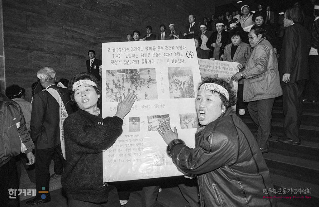 - 1988년 12월 20일 오전 11시 20분 광주특위 청문회가 진행중인 서울 여의도 국회의사당에 5.18 광주민중항쟁 관련 4개 단체 소속 회원 등 1백20여명이 광주학살의 철처한 진상규명을 요구하며 농성을 벌이고 있다