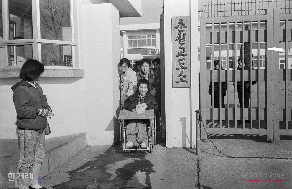 - 1988년 12월 21일 오전 10시 정부의 12.20조치에 따라 복역중이던 시국 공안사건 관련자 1백 28명이 전국 교도소에서 풀려난 가운데 지난 87년 2월 이른바 제헌의회그룹사건으로 구속돼 징역 7년을 선고받고 춘천교도소에서 복역중이던 최민씨가 어미니 박금순씨 등 가족과 친지 동료 10여명의 환영을 받으며 교도소 문을 나서고 있다.