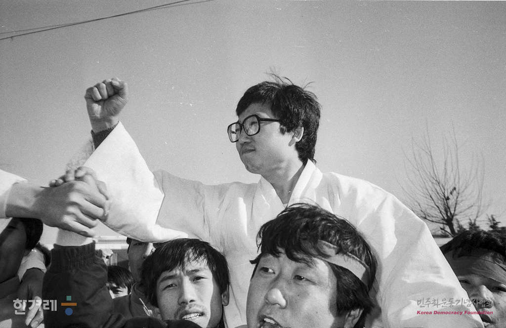 - 1988년 12월 21일 오전 10시 정부의 12.20조치에 따라 복역중이던 시국 공안사건 관련자 1백 28명이 전국 교도소에서 풀려난 가운데 현대엔진 농성사건으로 지난 3월 19일 구속되어 항소심 재판중인 전 현대엔진 노조위원장 권용목씨가 주먹을 쥔 팔을 들어 동료 노동자들의 환영에 답하고 있다.