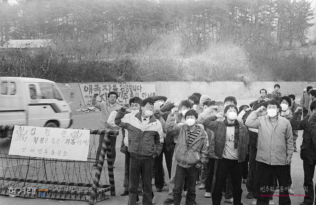 - 1988년 12월 21일 오전 10시 정부의 12.20조치에 따라 복역중이던 시국 공안사건 관련자 1백 28명이 전국 교도소에서 풀려난 가운데 공주교도소앞에서 양심수 환영을 하기 위해 온 시민 학생들이 양심수 전원석방을 요구하며 시위를 벌리고 있다.
