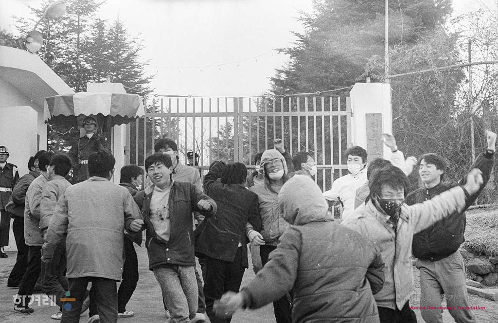 - 1988년 12월 21일 오전 10시 정부의 12.20조치에 따라 복역중이던 시국 공안사건 관련자 1백 28명이 전국 교도소에서 풀려난 가운데 공주교도소앞에서 양심수 환영을 하기 위해 온 시민 학생들이 양심수 전원석방을 요구하며 시위를 벌리고 있다.