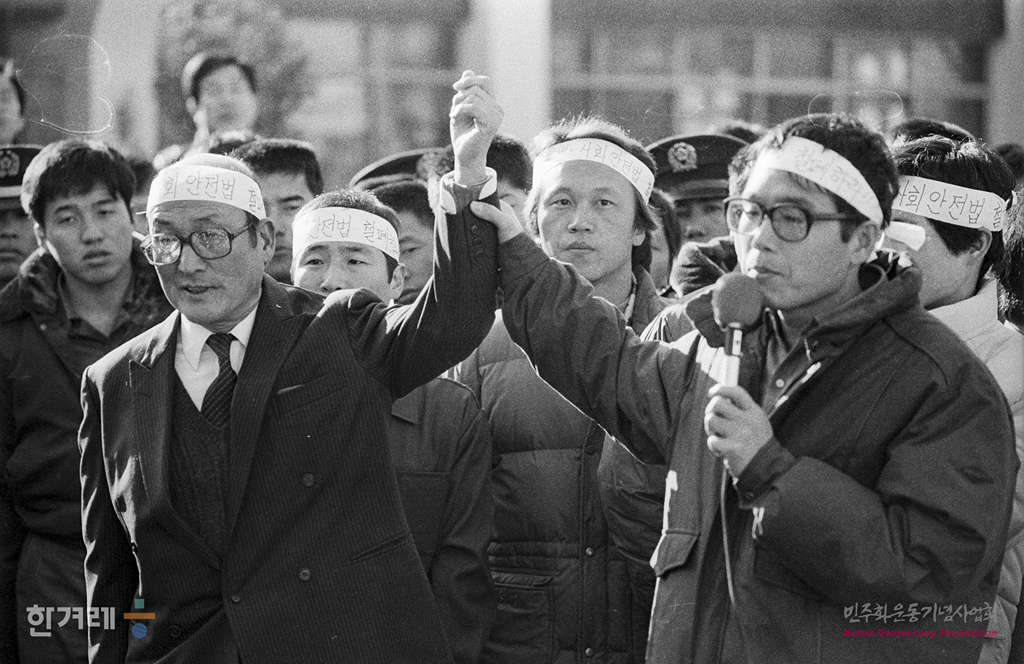 - 1988년 12월 21일 오전 10시 정부의 12.20조치에 따라 복역중이던 시국 공안사건 관련자 1백 28명이 전국 교도소에서 풀려난 가운데 1979년 남민전 사건으로 사형을 선고받았으나 세계 수학자들의 항의덕분에 무기징역으로 복역중이던 안재구 경북대 수학교수를 비롯한 김현장씨가 대구교도소앞에서 환영나온 시민 학생들에게 인사를 하고 있다.