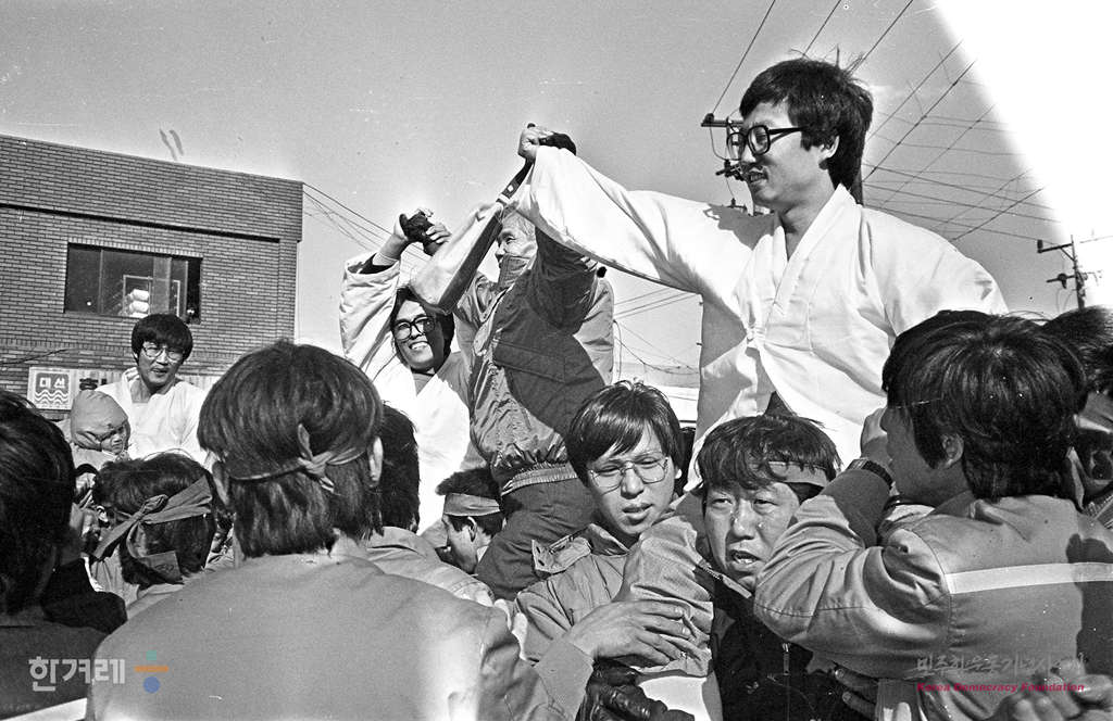 - 1988년 12월 21일 오전 10시 정부의 12.20조치에 따라 복역중이던 시국 공안사건 관련자 1백 28명이 전국 교도소에서 풀려난 가운데 현대엔진 농성사건으로 지난 3월 19일 구속되어 항소심 재판중인 전 현대엔진 노조위원장 권용목씨가 주먹을 쥔 팔을 들어 동료 노동자들의 환영에 답하고 있다.