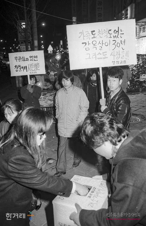 - 1988년 12월 22일 서울 청암교회 교인들이 서울 남영동에서 장기수들을 위한 가두모금 캠페인을 벌이고 있다.
