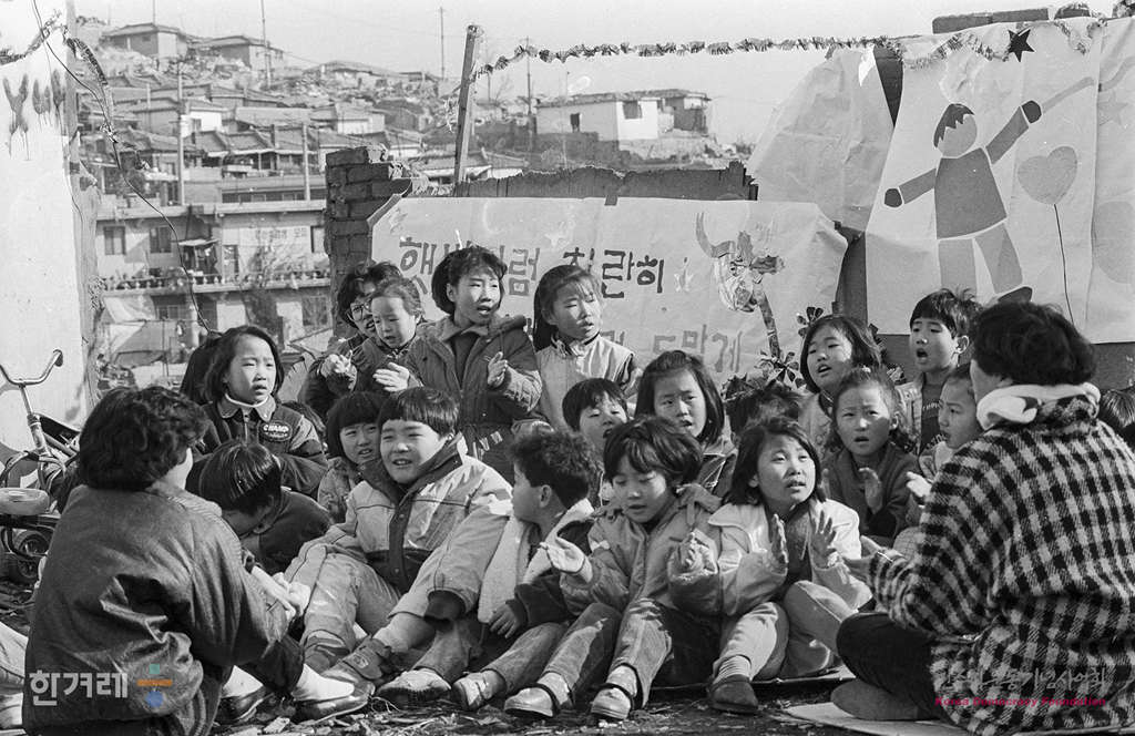 - 1988년 12월 24일 오후 성탄절을 하루 앞두고 서울 관악구 사당동 철거민촌 어린이들이 단국대생들로부터 연필 공책 등의 선물을 받고 활짝 웃는 얼굴로 크리스마스 캐롤을 부르며 즐거운 한때를 보내고 있다.