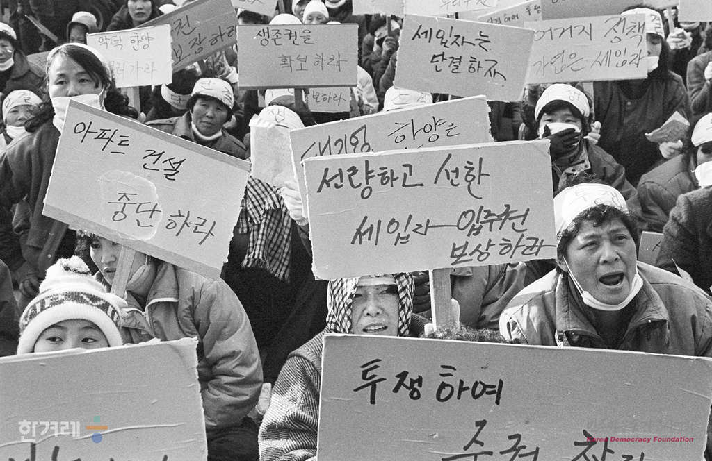 - 1988년 12월 26일 서울 전농동 세입자들이 동대문구청앞에서 철거에 앞서 세입자 이주대책을 요구하며 시위를 벌이고 있다.