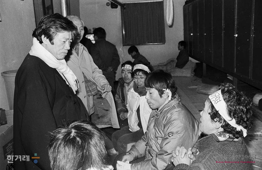 - 1988년 12월 26일 양심수 전원석방을 요규하며 과천 정부종합청사서 농성을 벌이다 경찰에 의해 강제연행된 12.21조치 석방자와 민가협 회원을 계훈제, 백기완씨등 재야인사들들이 위로방문을 하고 있다.