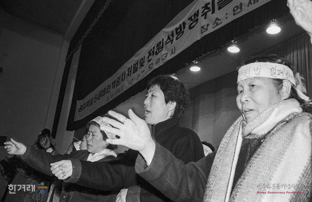 - 1988년 12월 27일 오후3시 광주학살 부정비리 책임자처벌 및 양심수 전원석방 쟁취를 위한 12.21석방자대회가 연세대 대강당에서 열려 재야인사 노동자 학생 등 1천5백여명이 참석한 가운데 열리고 있다.