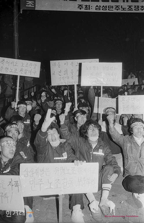 - 1988년 12월 29일 삼성민주노조쟁취위원회가 주최한 삼성민주노조쟁취 결의대회가 서울 명동성당 입구에서 열려 노동자와 학생들이 노조탄압을 규탄하며 집회를 갖고 있다.