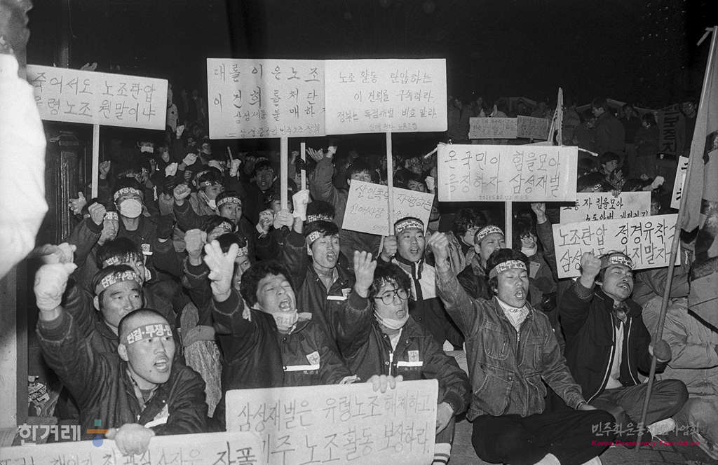 - 1988년 12월 29일 삼성민주노조쟁취위원회가 주최한 삼성민주노조쟁취 결의대회가 서울 명동성당 입구에서 열려 노동자와 학생들이 노조탄압을 규탄하며 집회를 갖고 있다.