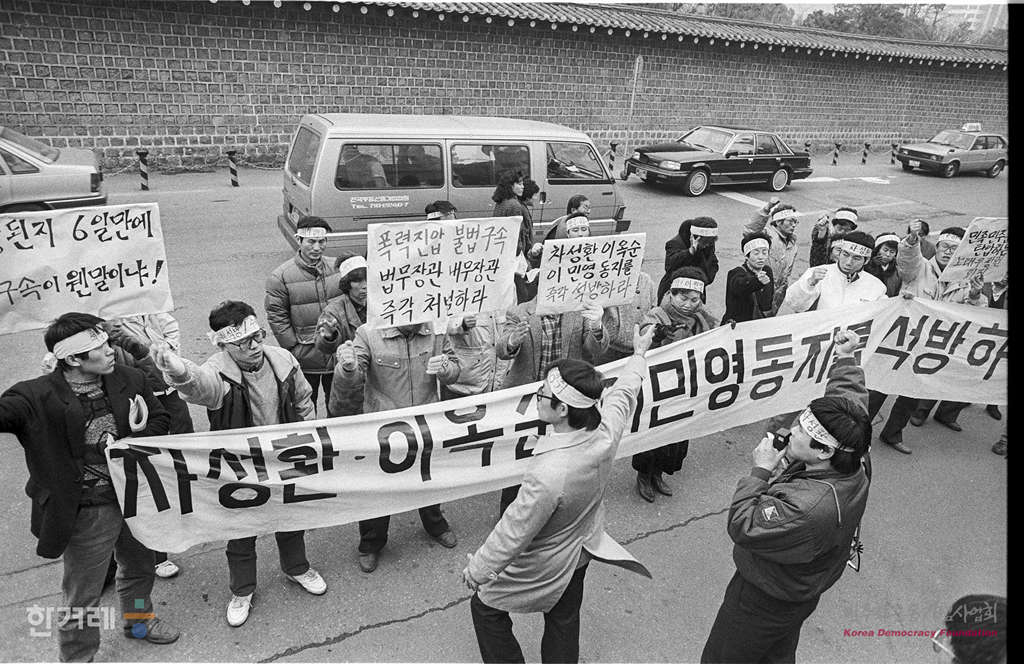 - 1988년 12월 29일 서울노동운동연합 소속 노동자들이 12.21조치로 석방된 지 6일만에 과천정부청사에서 양심수 전원석방을 요구하는 농성을 하다 특수공무집행 방해 치상, 집시법, 폭력행위 등 처벌에 관한 법률위반으로 구속된 이옥순 서울노동운동연합 직무대행을 비롯한 차성한 이민영씨의 석방을 요구하며 서울 검찰청사앞에서 농성을 하고 있다.