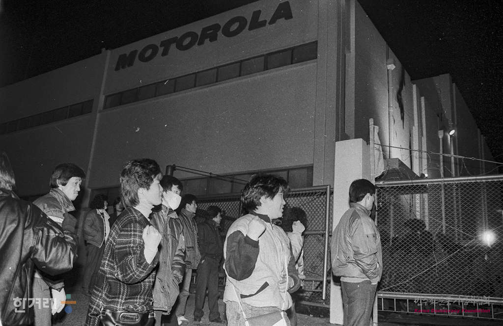 - 1988년 12월 30일 10일째 밤샘농성을 벌이다 30일 새벽 비노조원들에 의해 해산된 모토로라 코리아 노조원 1백 50여명은 몸에 신나를 뿌린 채 민주노조 인정을 요규하며 전산실에서 농성하고 있는 도충환 노조위원장과 면담을 요구하며 회사앞에서 농성을 계속하고 있다.