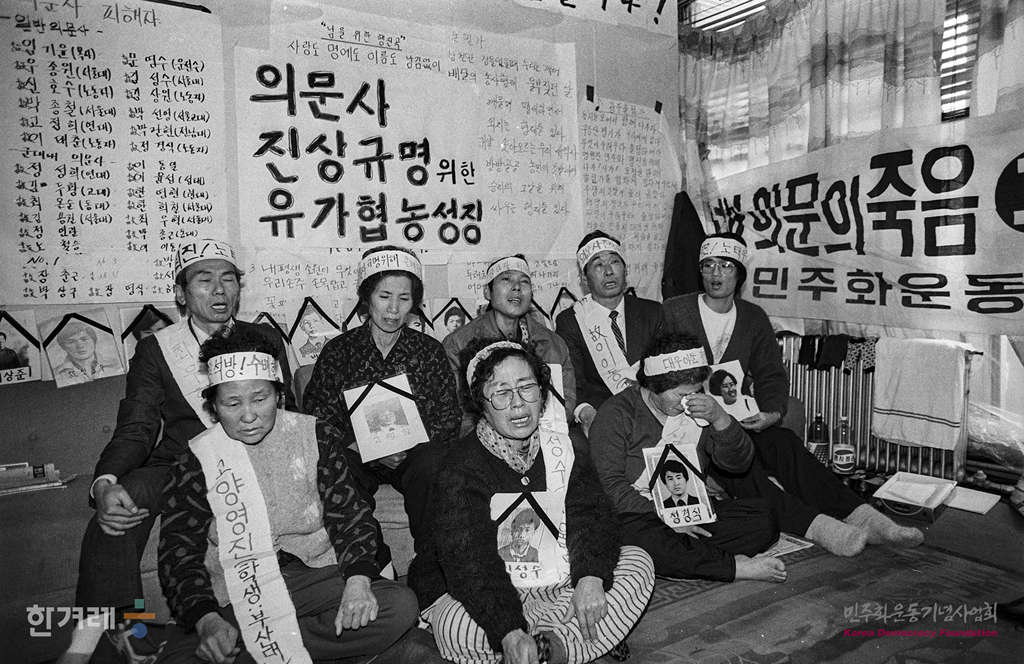 - 1988년 12월 30일 두 달 반동안 의문사의 진상규명을 요구하며 서울 종로5가 기독교회관 한국기독교교회협의회 인권위원회 사무실에서 농성중인 유가족들의 눈물을 흘리며 농성을 계속하고 있다.
