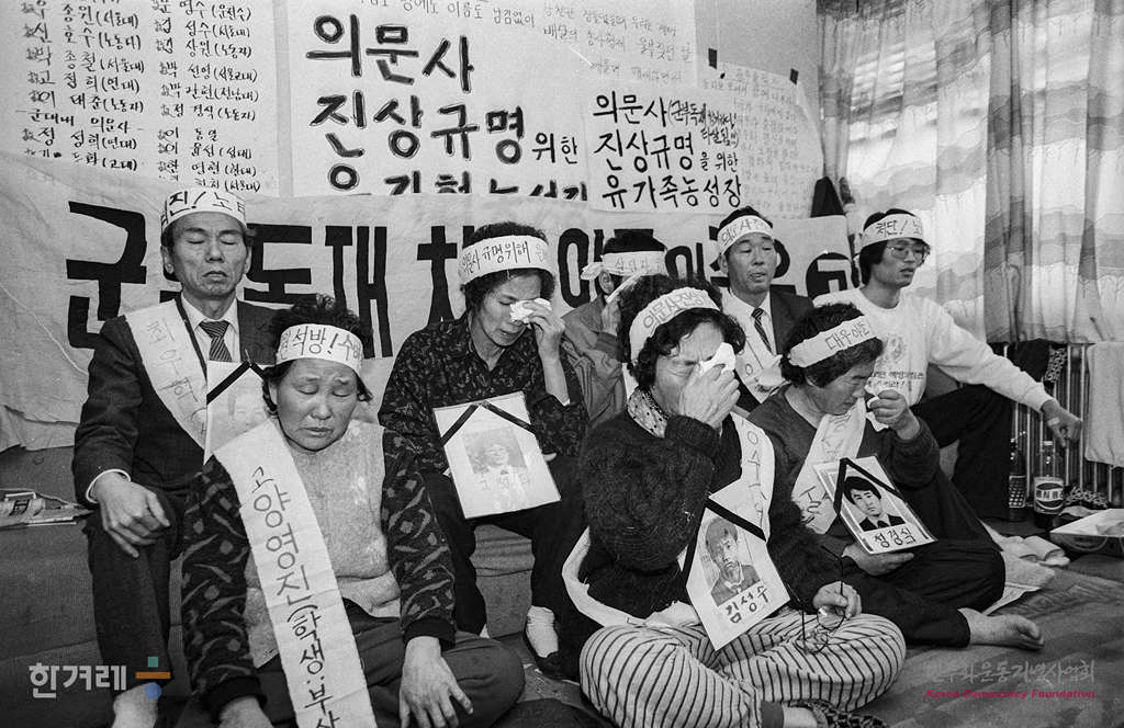 - 1988년 12월 30일 두 달 반동안 의문사의 진상규명을 요구하며 서울 종로5가 기독교회관 한국기독교교회협의회 인권위원회 사무실에서 농성중인 유가족들의 눈물을 흘리며 농성을 계속하고 있다.