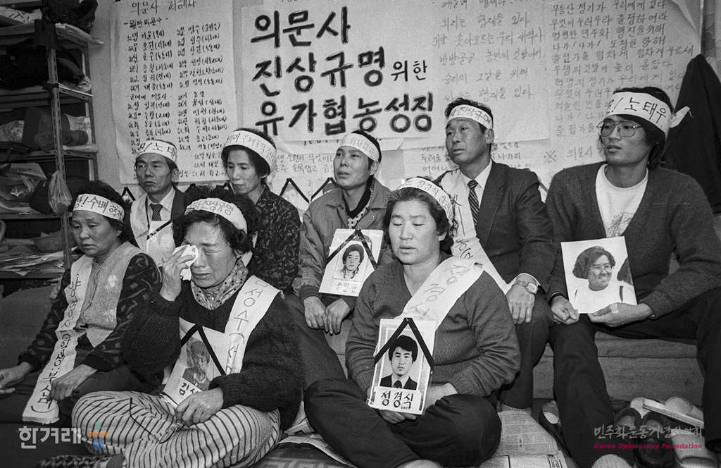- 1988년 12월 30일 두 달 반동안 의문사의 진상규명을 요구하며 서울 종로5가 기독교회관 한국기독교교회협의회 인권위원회 사무실에서 농성중인 유가족들의 눈물을 흘리며 농성을 계속하고 있다.