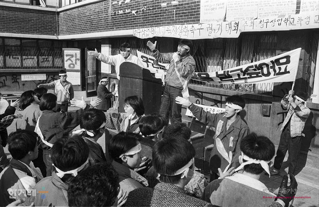 - 1989년 1월 4일 낮 12시 재단비리 척결과 부당해직 교사 복직을 요구하며 지난해 14일부터 교내에서 22일째 밤샘농성을 벌이고 있는 청구상업학교 교사 학생 학부모 등 2백여명은 교내운동장에서 교육정상화 촉구를 위한 제2차 궐기대회를 하고 있다.