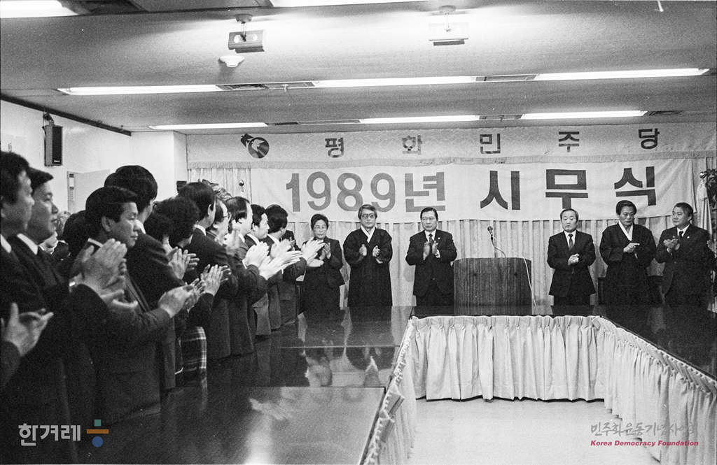 - 1989년 1월 4일 김대중 총재를 비롯한 평화민주당 관계자들이 서울 여의도당사에서 시무식을 갖고 있다.