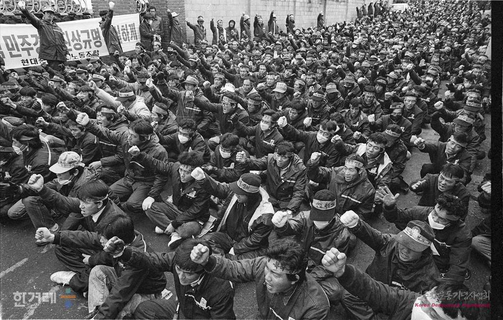 - 1989년 1월 12일 현대중공업 노동자 5천여명이 회사에서 4일째 테러 규탄집회를 가진 뒤 이 중 1천여명이 울산 남부경찰서앞에서 구속된 이형건 전 노조위원장 석방을 요구하며 농성을 벌이고 있다.