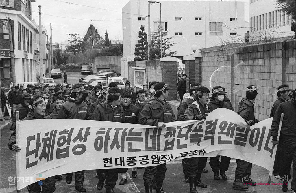- 1989년 1월 12일 현대중공업 노동자 5천여명이 회사에서 4일째 테러 규탄집회를 가진 뒤 이 중 1천여명이 울산 남부경찰서앞에서 구속된 이형건 전 노조위원장 석방을 요구하며 농성을 벌이고 있다.