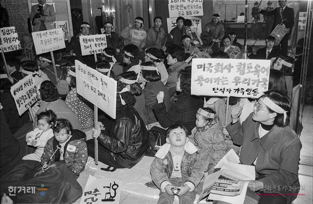 - 1989년 1월 12일 오후12시 한국IBM 노조와 전국사무금융노련 소속 노조원 등 5백여명은 노조간부들이 서울 영등포구 여의도도동 한국IBM 본사건물 1층 로비에서 한국IBM노조탄압 규탄 및 분쇄 결의대회을 하며 회사의 단체협약 및 임금교섭에 성실히 임할 것을 촉구하고 있다.