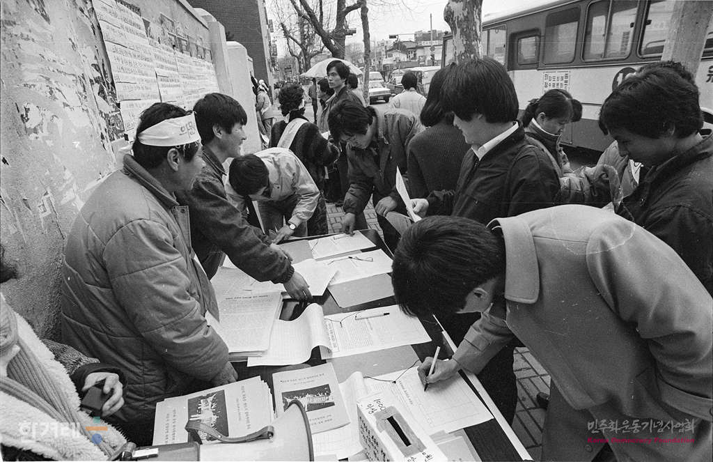 - 1989년 1월 12일 민주화운동 유가족협의회 산하 의문사 진상규명 대책위원회 소속 회원들이 서울 종로5가에서 의문사진상규명을 촉구하는 가두서명을 받고 있다.