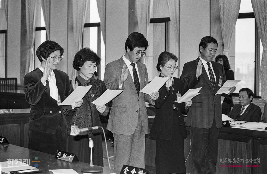- 1989년 1월 12일 국회 5공특위 제1소위는 새세대육영회 관련 비리를 조사하기 위해 주정일(전 새세대육영회 사무처장 ) 연홍숙(전 새세대육영회 사무처장 )강종문(새세대육영회 사무차장 ) 김동연(전 청와대 비서관) 김역중(전 악기부 사무관)(왼쪽부터)씨 등 5명을 출석시켜 증언을 듣고 있다.