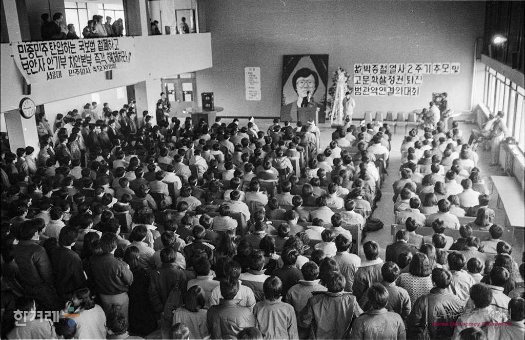 - 1989년 1월 13일 오후 2시 서울대생과 의문사유가족협의회 회원 및 구로지역에서 파업농성중인 노조원 등 5벽여명은 서울대 학생회관 2층 라운지에서 고 박종철열사 2주기 추모 및 고문학살정권 퇴진 결의대회를 하고 있다.