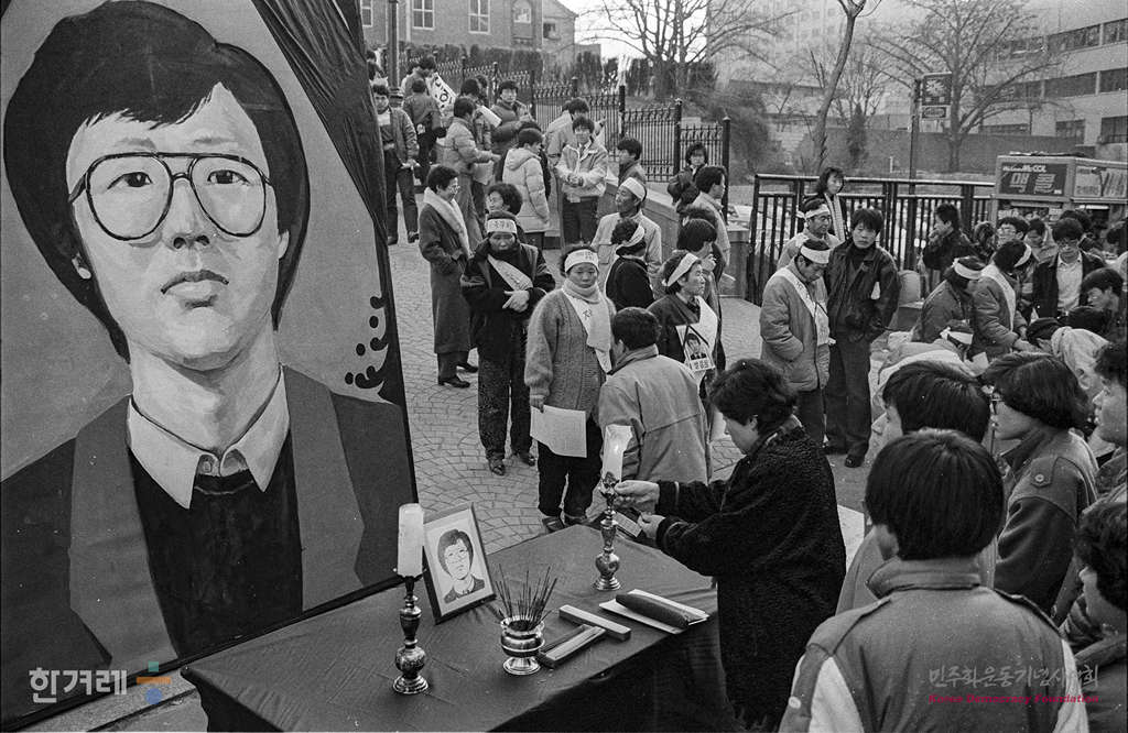 - 1989년 1월 14일 오후 6시 치안본부 대공분실에서 조사를 받다 고문으로 숨진 박종철씨의 2주기를 맞아 재야인사를 비롯해 학생 시민 5천여명이 참석한 가운데 서울 명동성당 문화관에서 민주열사 박종철 2주기 추모 및 노태우 정권퇴진 결의대회를 하고 있다.