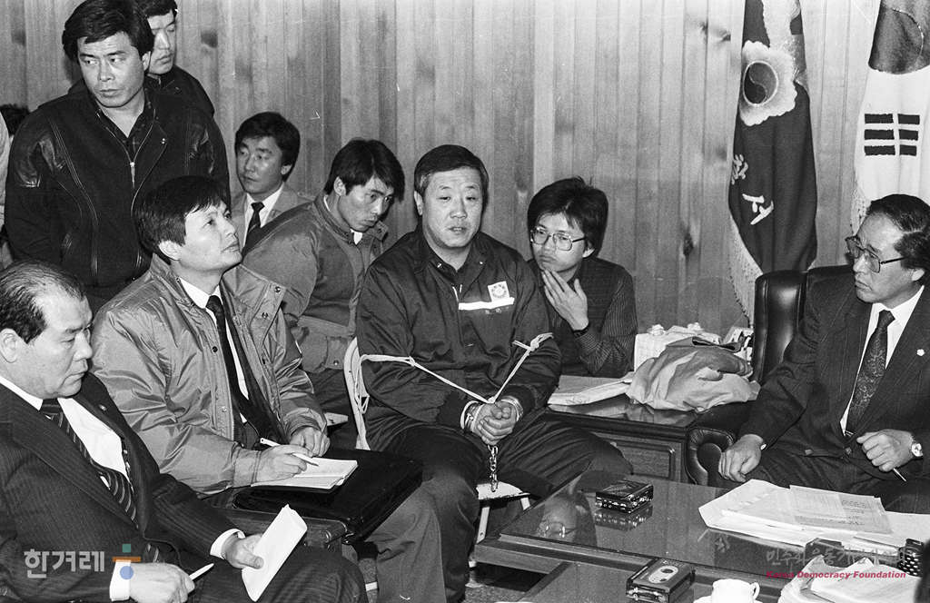 - 1989년 1월 17일 국회 노동위 현대테러사건 조사반은 울산경찰서 서장실에서 정보 대공과장 등 경찰 관계자와 수감중인 행동총책 이윤섭(제임스리)와 한유동 현대중공업 전무 그리고 현대중공업 노동자 정수철씨를 등을 불러 경찰과 회사쪽의 사전모의 혐의와 관련해 신문을 하고 있다.