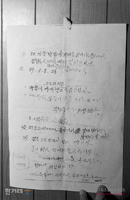 - 1989년 1월 17일 국회 노동위 현대테러사건 조사반은 울산경찰서 서장실에서 정보 대공과장 등 경찰 관계자와 수감중인 행동총책 이윤섭(제임스리)와 한유동 현대중공업 전무 그리고 현대중공업 노동자 정수철씨를 등을 불러 경찰과 회사쪽의 사전모의 혐의와 관련해 신문을 하고 있다.